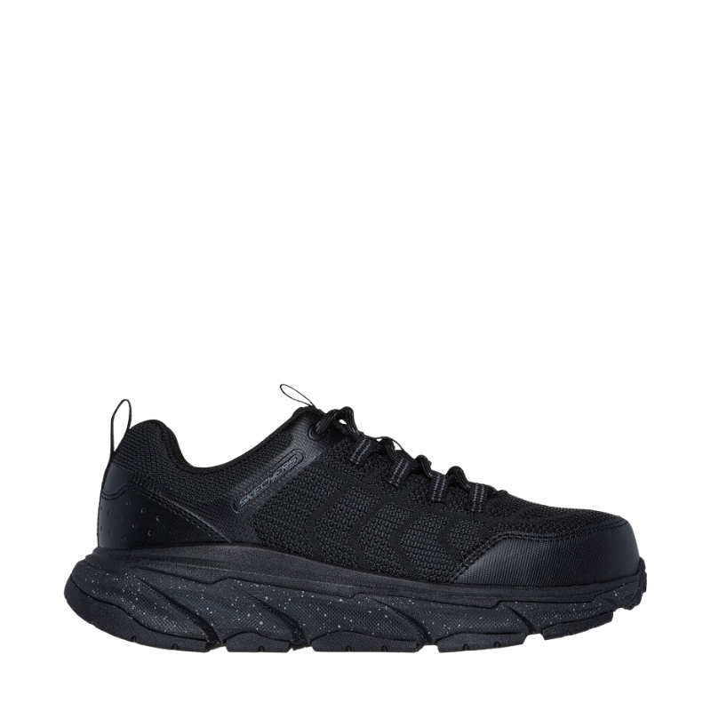 This slip-resistant athletic style features a lace-up synthetic fabric upper, a cushioned Skechers Air-Cooled Memory Foam® insole, and a composite safety toe.